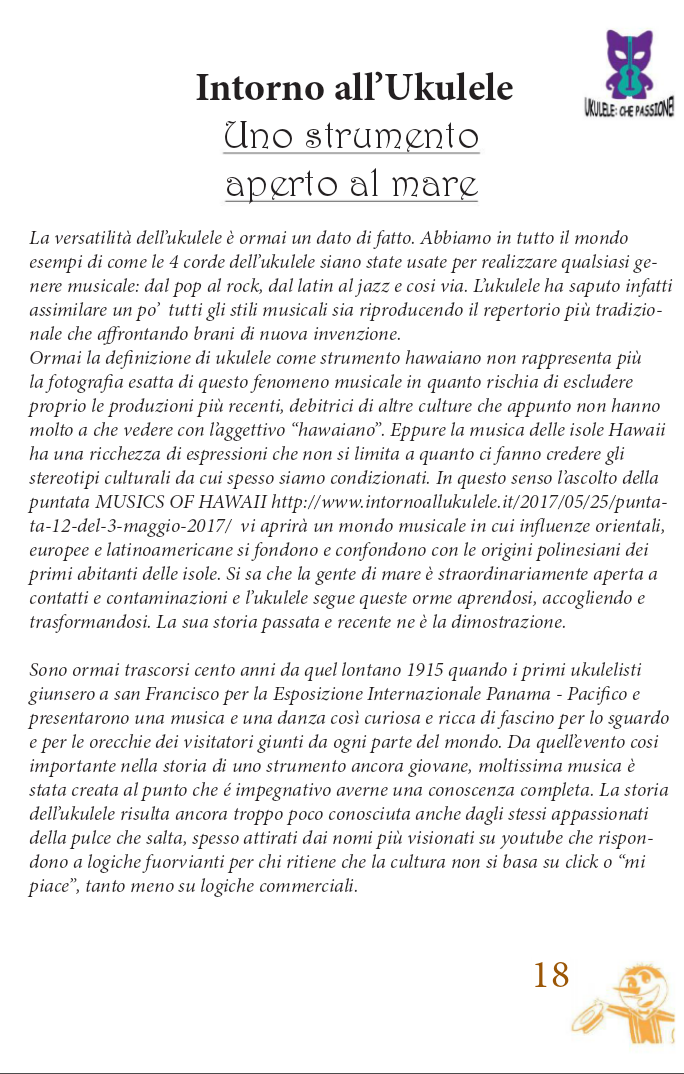 Sono ormai trascorsi cento anni da quel lontano 1915 quando i primi ukulelisti giunsero a san Francisco per la Esposizione Internazionale Panama – Pacifico e presentarono una musica e una danza così curiosa e ricca di fascino per lo sguardo e per le orecchie dei visitatori giunti da ogni parte del mondo. Da quell’evento cosi importante nella storia di uno strumento ancora giovane, moltissima musica è stata creata al punto che é impegnativo averne una conoscenza completa. La storia dell’ukulele risulta ancora troppo poco conosciuta anche dagli stessi appassionati della pulce che salta, spesso attirati dai nomi più visionati su youtube che rispondono a logiche fuorvianti per chi ritiene che la cultura non si basa su click o “mi piace”, tanto meno su logiche commerciali.