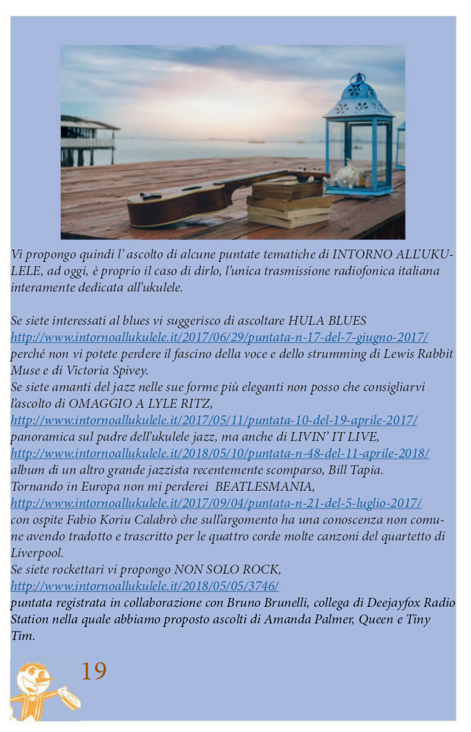 Vi propongo quindi l’ ascolto di alcune puntate tematiche di INTORNO ALL’UKULELE, ad oggi, è proprio il caso di dirlo, l’unica trasmissione radiofonica italiana interamente dedicata all’ukulele.