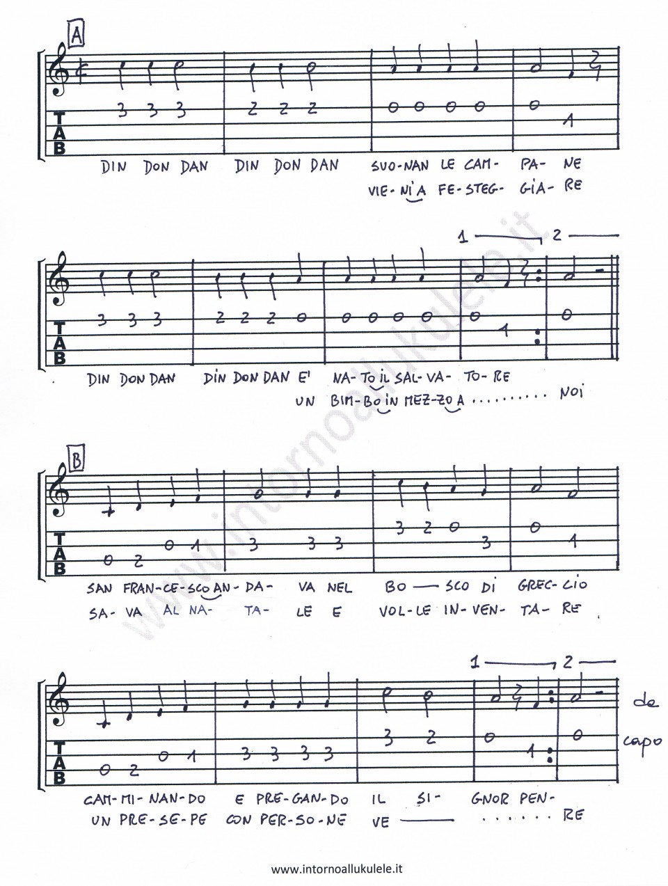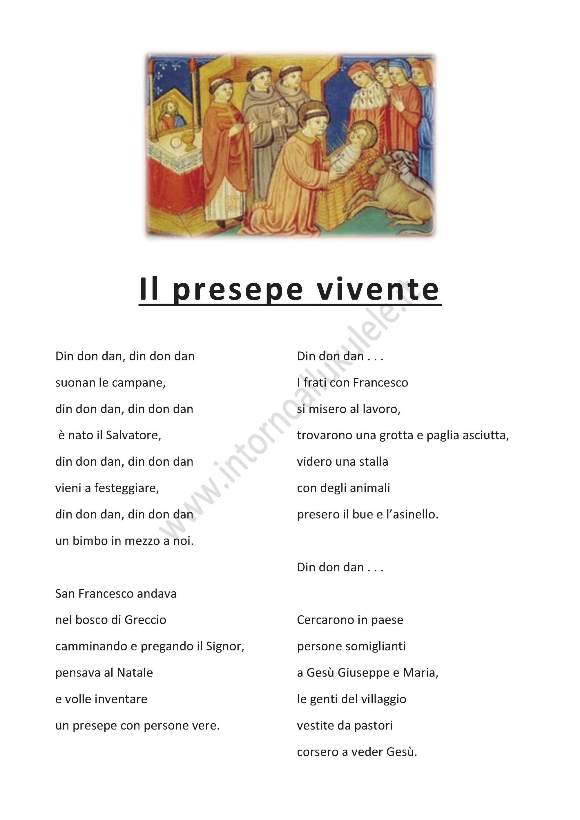 Il tema scelto era la nascita del Presepe vivente, avvenuta a Greccio per desiderio di San Francesco. Il testo è stato inventato sulla falsariga del gioco di drammatizzazione che i bambini stavano giorno dopo giorno mettendo in scena. Musicalmente è nato prima il ritornello che simpaticamente riproduce lo scampanio delle campane a festa: din don dan – din don dan, utilizzando accordi che richiedono un solo dito.