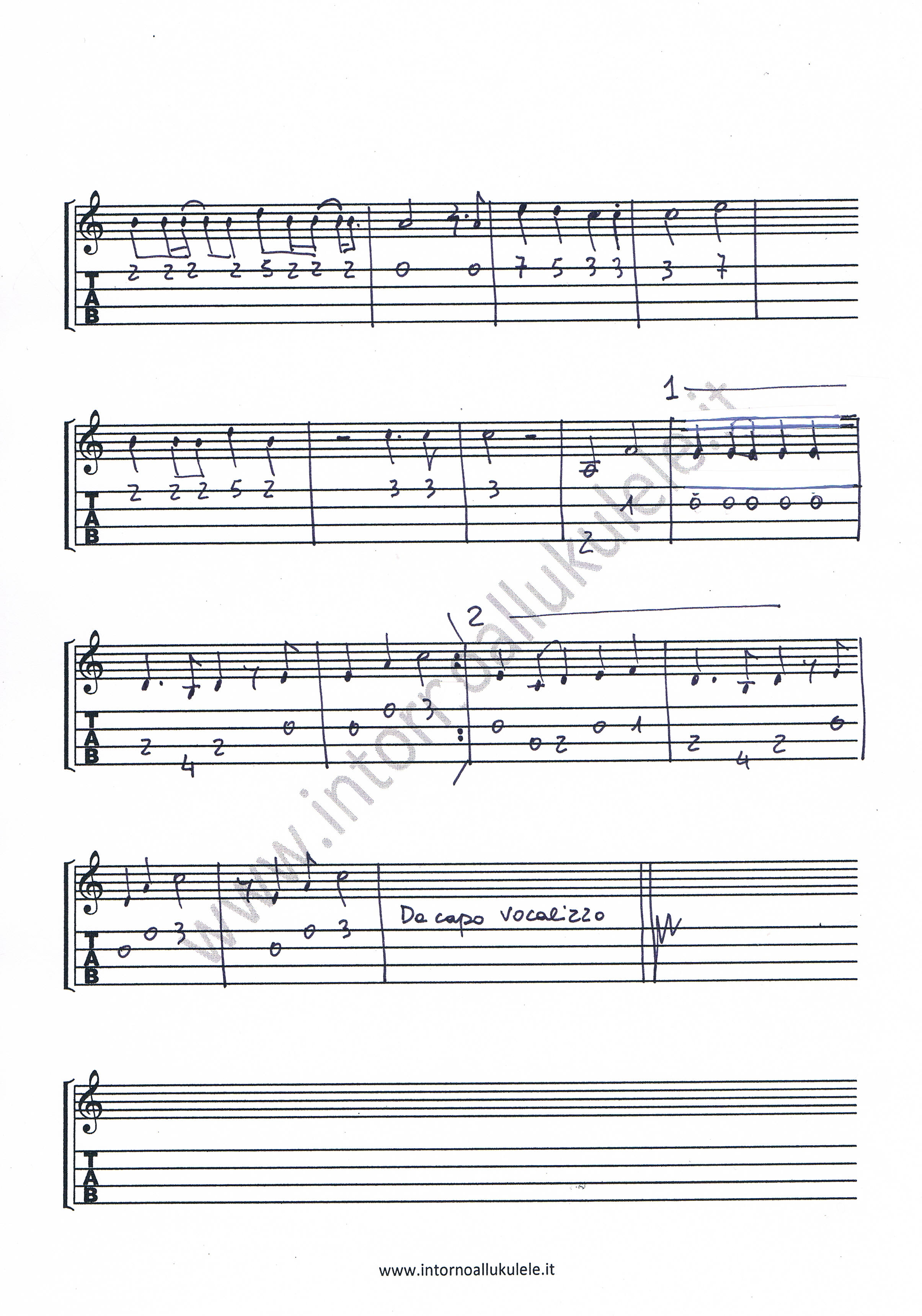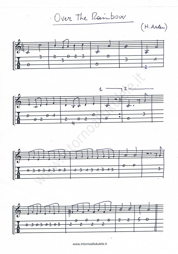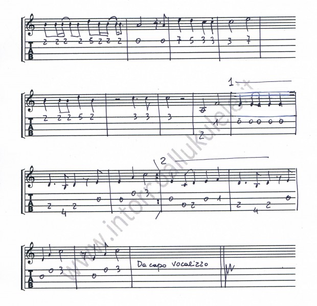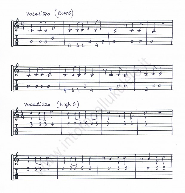 La versione di IZ inizia con un vocalizzo che ho trascritto sia per un ukulele high G che per uno low G, valutate voi i pro e i contro delle due versioni: