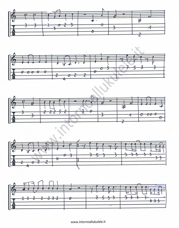 Sul web è facile trovare testo e accordi per ukulele di questo brano, più difficile trovarne la melodia, ho pensato quindi di proporre alcune trascrizioni con intavolatura che potrebbero essere inserite come strofa strumentale della canzone vede nella presenza della voce un elemento irrununciabile. Per la particolare estensione della canzone è preferibile secondo me utilizzare un ukulele accordato low G.