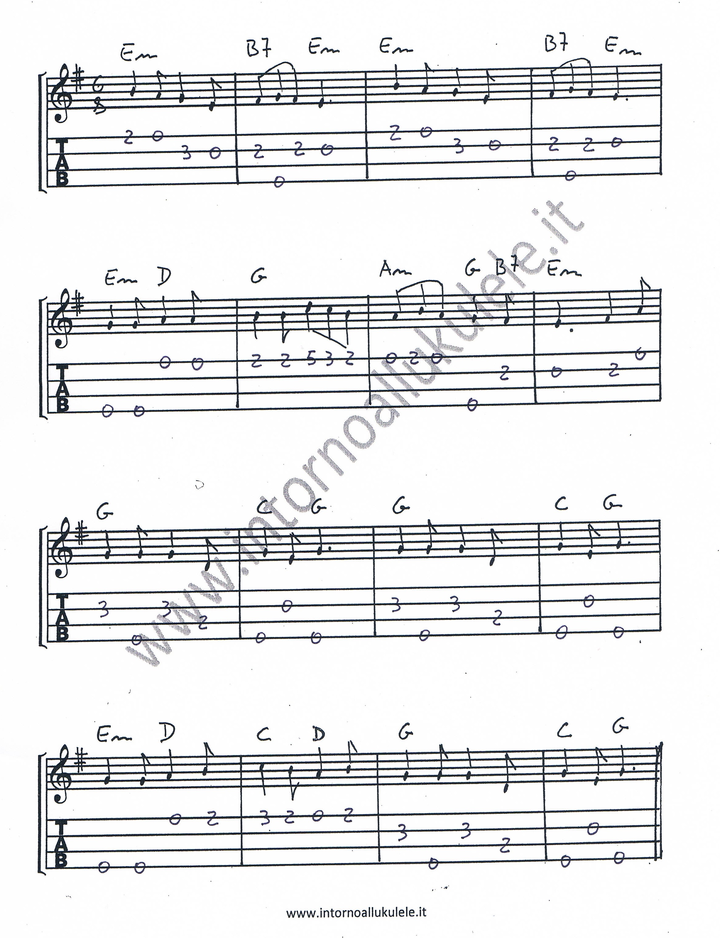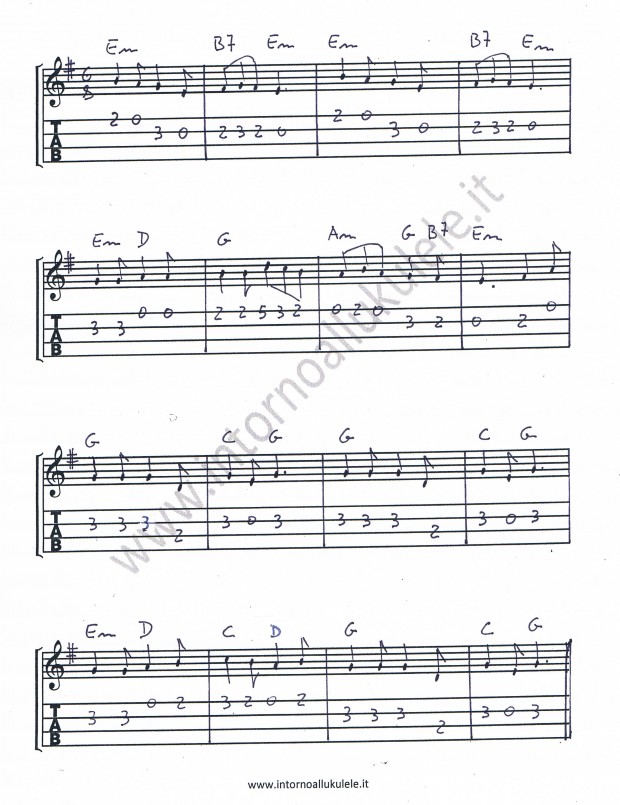 Ho trascritto in intavolatura due versioni di questa melodia: la prima da eseguire in modo lineare come se fosse una chitarra, la seconda con alcuni passaggi melodici in stile “campanelas”, come se l’ukulele fosse una piccola arpa capace di produrre ogni singola nota su corde diverse, queste, rimanendo in vibrazione, si sovrappongono a creare quel fantastico colore che gli antichi chiamavano “campanelle”. A livello tecnico fate attenzione a tenere le dita della mano sinistra sempre premute, proprio per evitare di fermare la risonanza delle corde. Buon divertimento!