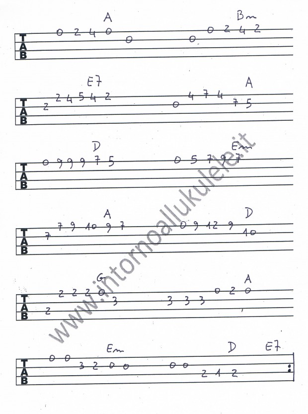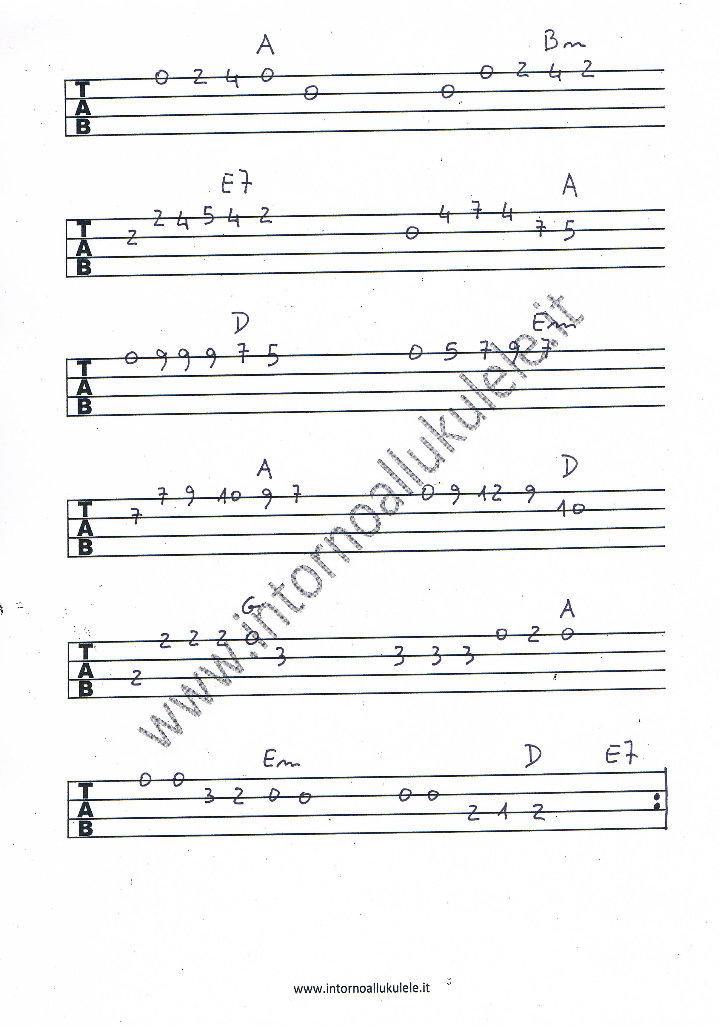 Ho scritto l’intavolatura rispettando la tonalità originale del video e cercando di metter in evidenza i singoli versi che si succedono brevi e regolari; perciò può essere un ottimo esercizio per imparare a legare i suoni a imitazione del canto. Occorre fare attenzione  a scegliere le dita della mano sinistra soprattutto nelle posizioni alte, evitando di fare salti e di staccare il suono.