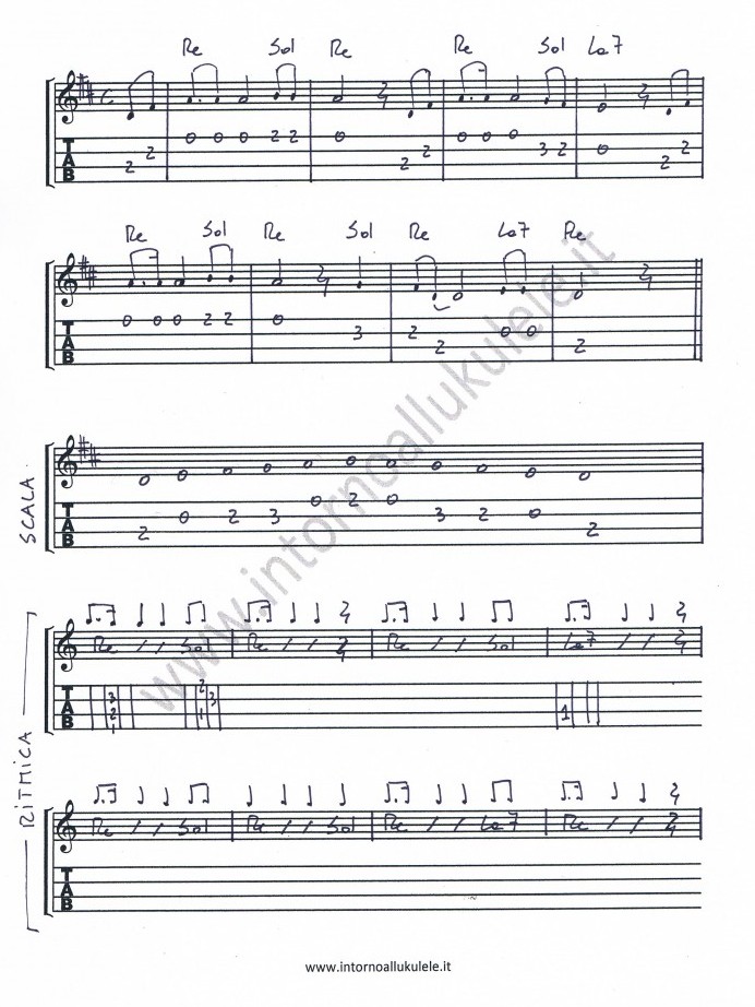 La versione che vi propongo è in Re maggiore. Ho scritto l’intavolatura del canto seguita dalla scala di Re in prima posizione, ossia usando quando possibile anche le corde a vuoto. Segue una versione ritmica di accompagnamento che ripropone il ritmo della melodia armonizzato.