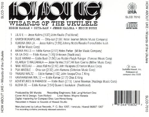 I maghi di cui ci occupiamo sono tutti nativi delle isole Hawaii: Jesse Kalima, Eddie Kamae, Eddie Bush e Ohta San. Tutti appartenenti a diverse fasi della sia pur breve storia del nostro strumento, perciò ancora più piacevoli da ascoltare anche a random, abbandonando la successione scelta dalla Lehua Records nel 1974.