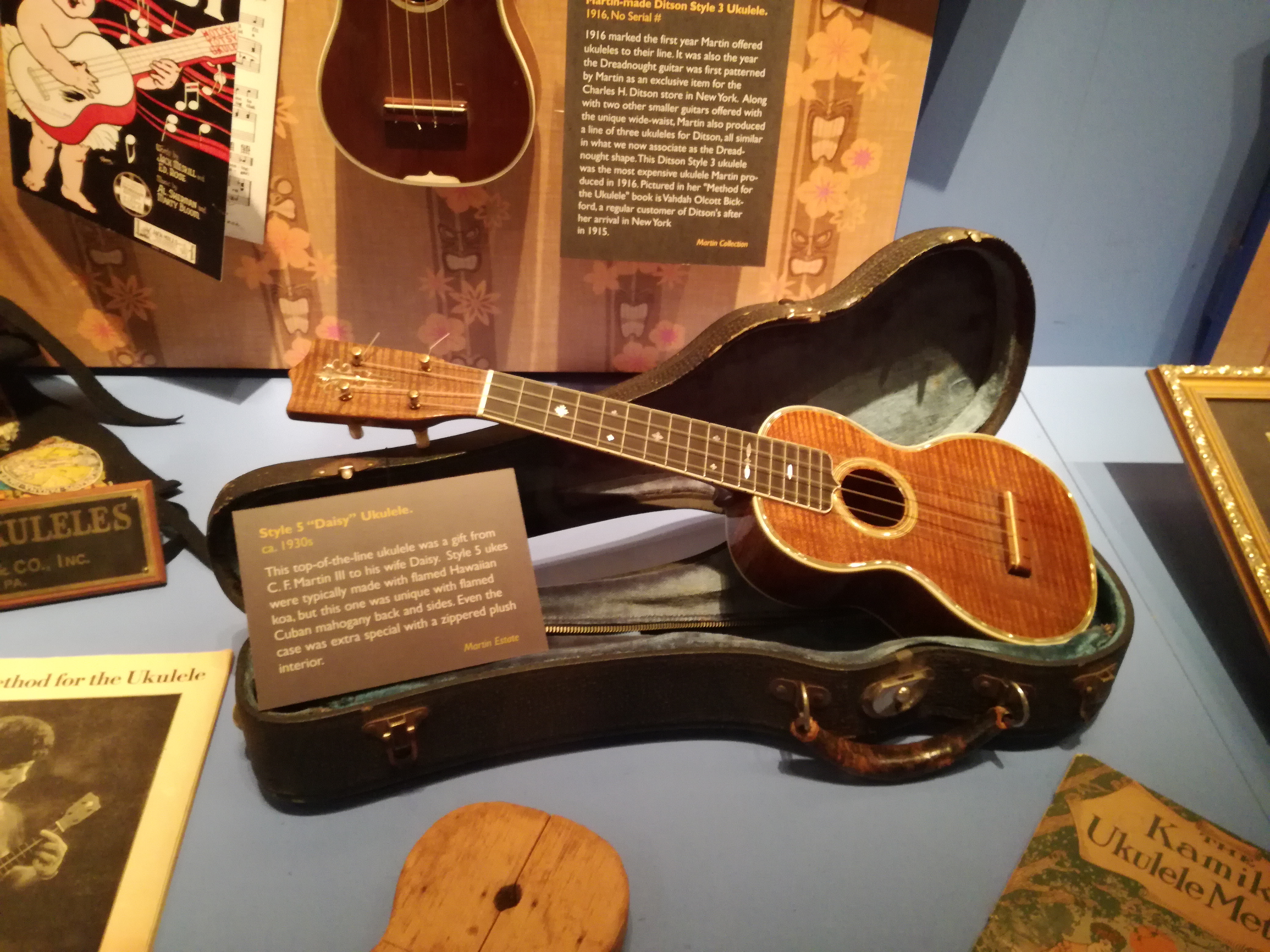 In 2016 I went to visit my parents in the USA, in Pennsylvania, for the Christmas Holidays. The thermometer measured about 21 degrees below zero. The house in the country was surrounded by very high snow, which covered the entire surrounding area, like an immense carpet of whipped cream that you could not see the end of. I discovered that the Martin Museum was about a half hour drive from home. Despite the ice on the asphalt and the risky driving, I jumped in the Jeep with my mother and went to Nazareth. Entrance in the museum is free. Arranged in a single large room, divided by periods and instruments, it has very detailed information on their history and evolution over the decades. I noticed the Konter ukulele, among others, but did not dwell much on it. The mother-of-pearl decorations and inlays of the 1916 Taropatch, or the “Daisy” 5K, 1930, a gift from CF to his wife Daisy, captured most of my attention.