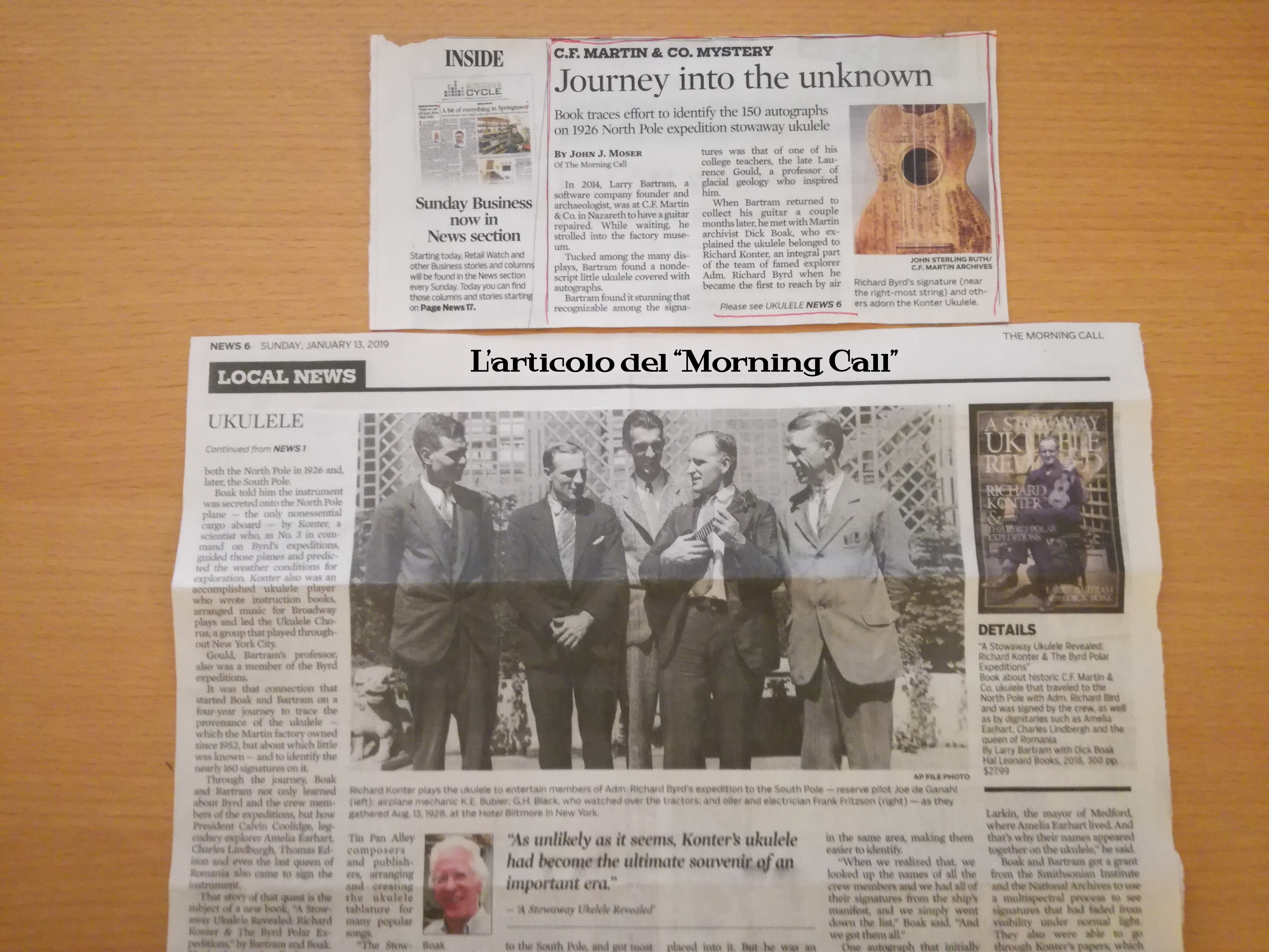In 2014 Larry Bartram, founder of a software company and archaeologist, went to the Martin Museum in Nazareth to have his guitar repaired. Among the many ukuleles on display, he was attracted to one in particular, completely covered with autographs. With great surprise, among the signatures he saw that of Laurence Gould (now deceased), his college professor of geology. The museum archivist, Dick Boak, told him that the ukulele had belonged to Richard Konter, a member of the team who first flew to the North Pole in 1926, in the expedition led by the famous explorer, Admiral Richard Byrd. (The story tells that in reality it was the Italian Umberto Nobile, on board the Norge airship, the first to fly over the Pole, and that Byrd attributed himself the primacy …). Bartram discovered that his professor had taken part in the Arctic expedition. He decided, along with Dick Boak, to investigate further this ukulele, which Martin has owned since 1952, and of which little was known of previous years.