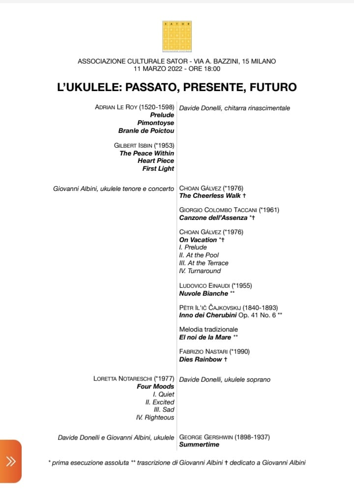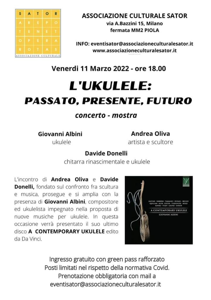 11 Marzo 2022 Concerto- Mostra “Ukulele: passato presente e futuro” (in duo con Giovanni Albini), Ass. Culturale SATOR, Milano Video 1 Video 2 Locandina Programma di Sala