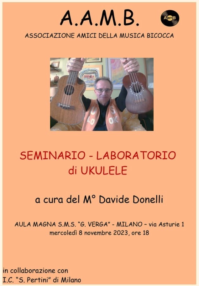 8 Novembre 2023 Seminario – Laboratorio di ukulele, Associazione Amici della Musica Bicocca, Milano Locandina